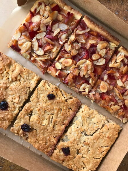 Our Fruit Tart with Almonds is baked on shortbread crust and topped with ‘caramelly’ almonds. Fruits and berries we use for filling vary throughout the season. Rhubarb-Strawberry tart is our spring-time seasonal hit, closely followed by Plum Tart that is available most of the year. We also make Peach-Raspberry, Nectarine-Raspberry, Pear-Ginger, Apple-Cranberry, and other seasonal flavors, all depending on seasonal availability. At the markets you might find some tarts with pecans instead of almonds.