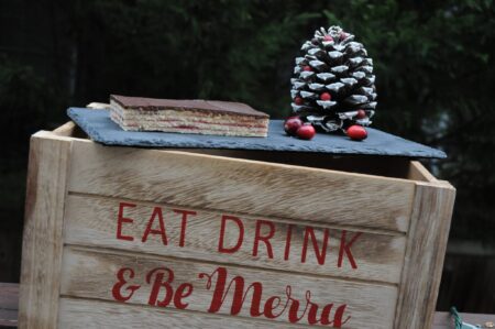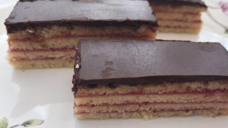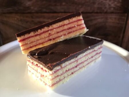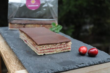 Lingonberry Layered Cake is called Layered Cookie in Estonia, but it really is more a cake than cookie. Super thin layers of soft sponge are alternated with organic lingonberry jam* and topped with dark chocolate – can’t call it anything other than pure deliciousness! This treat is one of the baker’s favorite and excellent enjoyed with cup of tea or coffee any time of the year. Although we at the bakery love Lingonberry Layered Cake too much to only enjoy small slices, it is perfect cut in smaller portions and shared with friends when just a bite of sweetness does the trick. Food is always better when shared:).